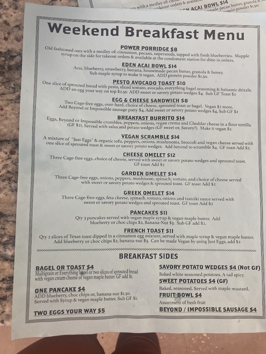 A mixture of “Just Eggs”, organic tofu, peppers, onions, mushrooms, broccoli and vegan cheese served with one slice of sprouted toast & sweet or savory potato wedges. Add a Beyond sausage or Beef PAOW Shreds inside or on the side for $4.40 more! OH-So GOoD!